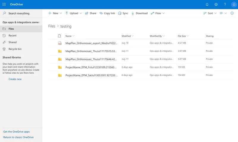 Seamlessly integrate DroneDeploy maps with Microsoft OneDrive. Keep your teams up to date with the latest aerial imagery with Auto Exports of DroneDeploy exports directly into OneDrive folders.
