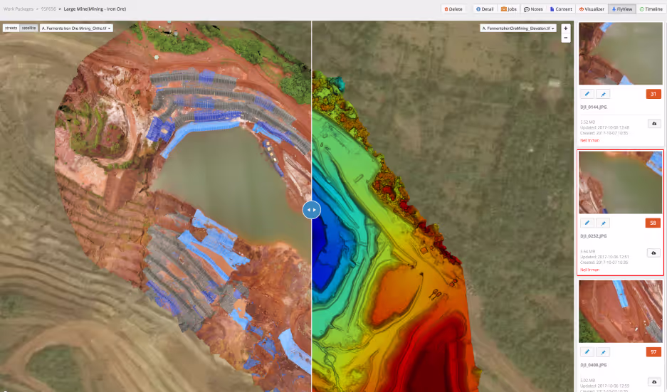 You can export images, Orthomosaic, PointCloud, Elevation, and NDVI layers from DroneDeploy directly into your Optelos project where you can easily organize, analyze, annotate, and deliver completed work packages to your clients and stakeholders.